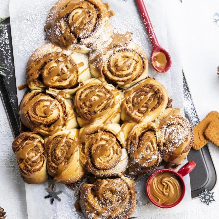 9Verwarm de speculoospasta in de magnetron tot hij vloeibaar is. Giet of verdeel over de broodjes. Serveer terwijl het nog warm is met poedersuiker!