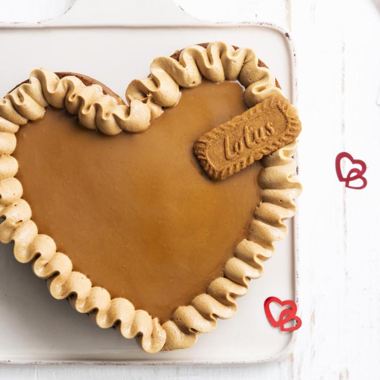 6Laat volledig afkoelen voordat je de cake in de lengte doormidden snijdt, zodat je twee hartvormige cakes hebt. Besmeer de onderste taart met 4 eetlepels speculoospasta en leg de andere helft erop.