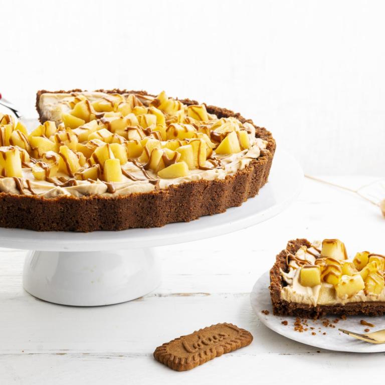 1Verwarm de oven voor op 160°C. Meng de gemalen Biscoff speculooskoekjes met de boter tot een goedverdeeld mengsel. Voeg toe aan een ronde taartvorm van 28 cm. Druk de koekjeskorst met je handen stevig op de bodem en zijkanten.